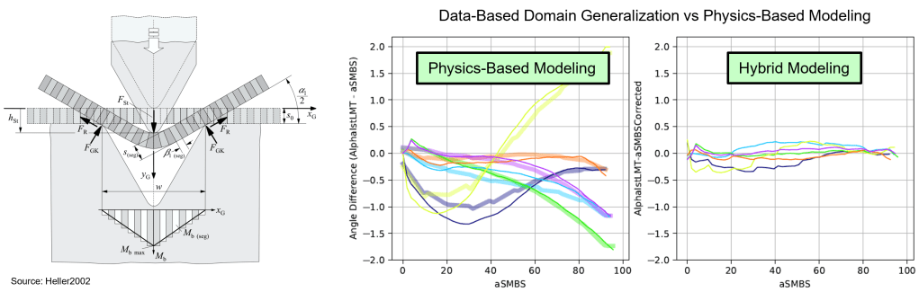 In recent years, sensor and edge processing technologies allow for almost real-time monitoring of complex industrial processes. However, there might still be phenomena and process details that cannot accurately be monitored and regulated without including a form of prediction or simulation of the process evolution. An example is demonstrated in Figure 1 of the metal bending process. A set of sensors can monitor the process, however the operator requires a simulation of the upcoming evolution of the process in order to proactively regulate the applied force and achieve the desired final angle. The problem becomes even more challenging when we consider the case of different types of material and different scenarios (e.g., machine tools and configurations). We will present a framework for combining physical-based modeling techniques with machine-learning techniques in order to improve the prediction accuracy of the process evolution. Furthermore, we will present a methodology for domain generalization into multiple scenarios.